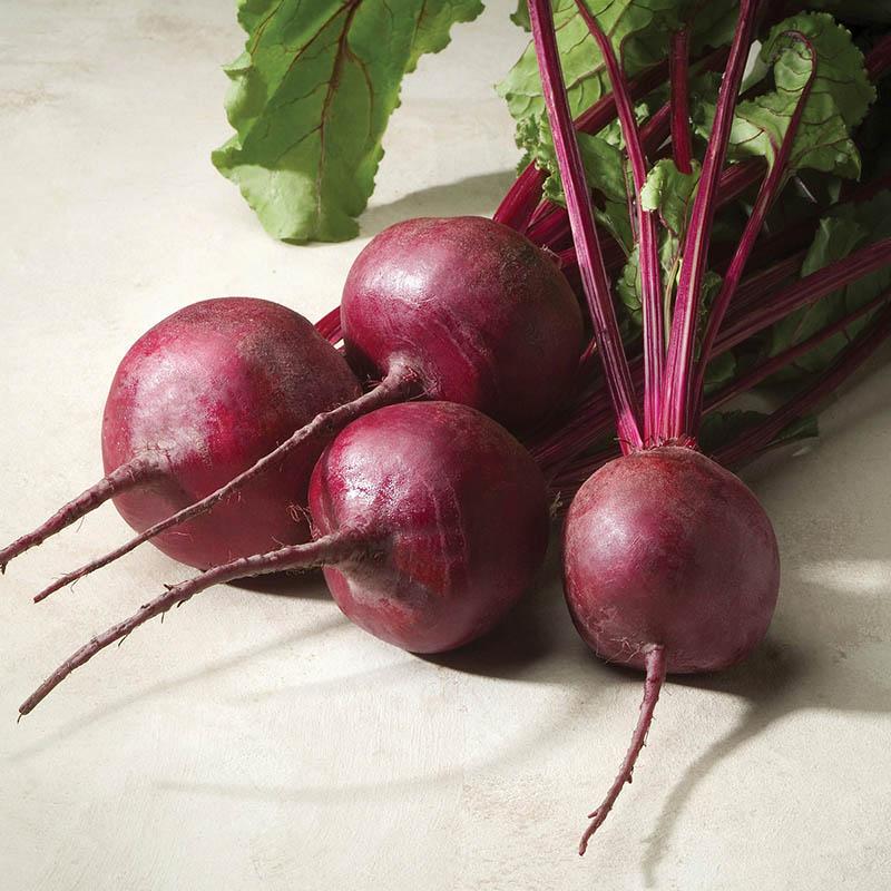 Merlin is a hybrid beet that has an exceptionaleating quality and attractive dark green, glossy tops.Its uniform, round roots have a refined tap root and dark red interior color that tolerates zoning during drought and adverse weather. The tall 15 to 17” tops hold their dark green color throughout the season and lend themselves well to the fresh bunched beet market. Merlin receives high ratings for sugar content, and it also has intermediate resistance to downy mildew and Cercospora.