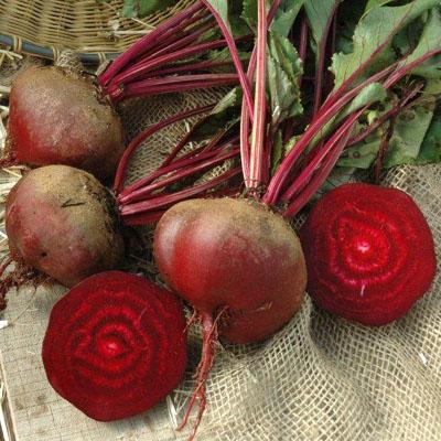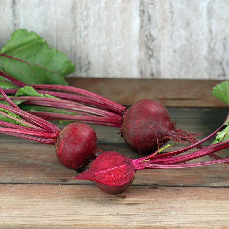 This strain of this popular winter keeper type beet produces roots that are not quite as large as the Lutz strain. The glossy green tops have deep pink veins and the stems are deep pink striped with green. The delicious beets have an oblate shape that tapers towards the tap root. The roots have a tender flesh that is sweet and store well for several months after harvest.