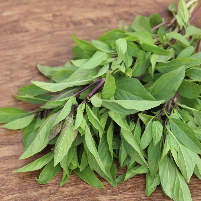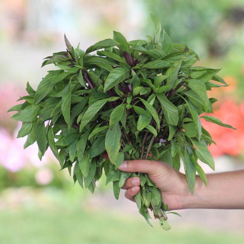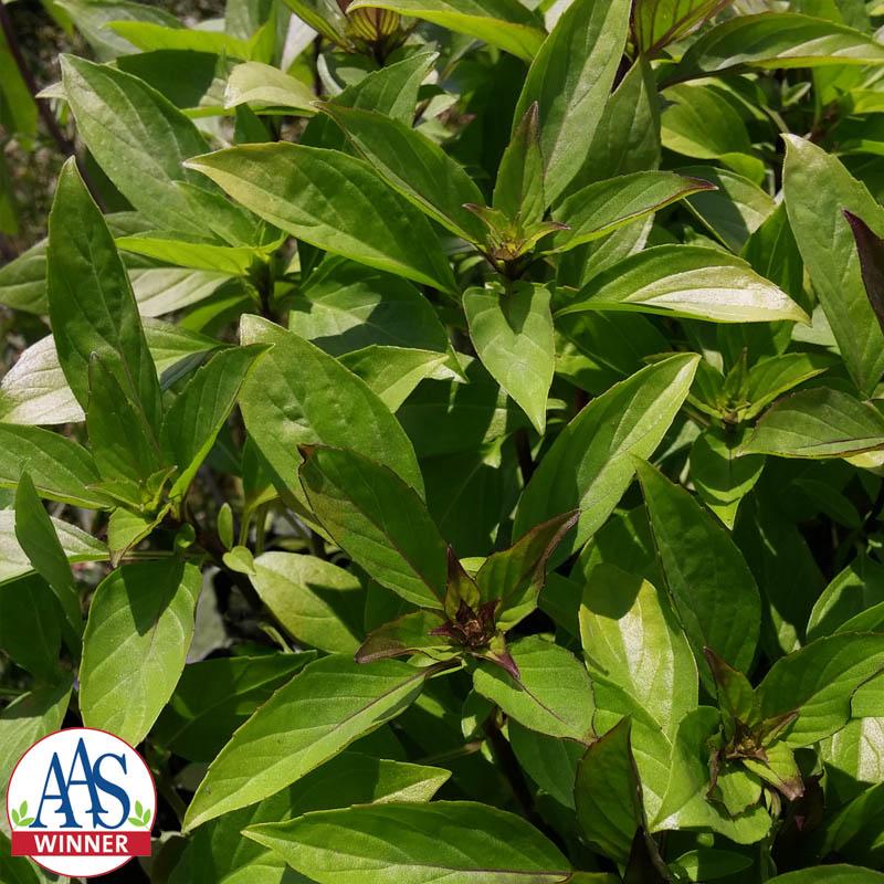 A well branched, erect, sweet Thai basil, Siam Queen reaches 30-40" in height. Sweet and spicy fresh leaves exude an anise overtone, while the dried leaves have a licorice basil aroma. The 3 to 4" leaves are much larger than standard basil. The compact inflorescences on top of the bright green plant make it ideal for ornamental gardens and patio container.