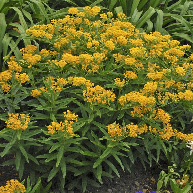 A virtually hassle-free, very long lived perennial, this cultivar of our native A. tuberosa offers three months of golden yellow blooms from early through late summer. Deadheading the flowers will stimulate another bloom cycle about a month after the first one. The flowers, which are heavily laden with nectar and pollen, are particularly attractive to hummingbirds, Monarch butterflies, bees, and other beneficial insects. Gather bouquets of Asclepias all summer long; the long stems are wonderful for cutting and are long-lasting. Sear the ends of the cut stems over a flame to stop the milky sap from leaking out. Following the fabulous flowers, green fruits develop which rupture to reveal seeds with long, silvery-white, silky hairs reminiscent of its cousin, common milkweed. These are great to use in dried flower arrangements.